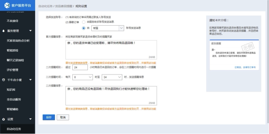 1、打开客户服务平台-自动化任务,点击“立即开启”退货寄回提醒,即可进入设置页面;