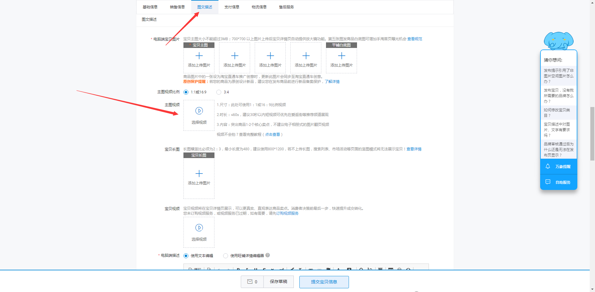 进入宝贝发布后台以后,在【图文描述】,【主图视频】这个位置就可以上传主图视频