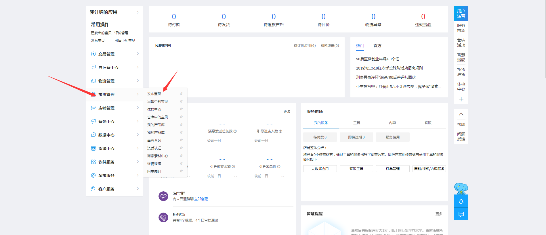 一般我们上传主图视频是通过【卖家中心】,【发布宝贝】