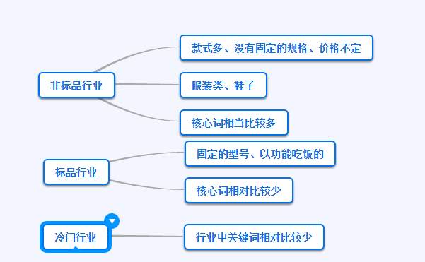2.标品行业:有固定的型号,以功能吃饭的行业(比如:手机、水杯、空调、电脑、)款式比较少,相比较非标品行业这种行业它的核心词及比较少(耳机:耳机就叫耳机,叫不了别的名字)。