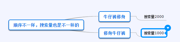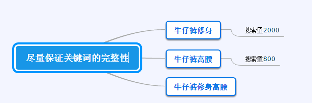 例:牛仔裤修身(搜索热度2000)牛仔裤高腰(搜索热度800)
