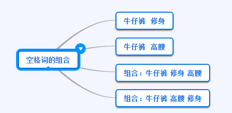5.空格词和非空格词的组合:例:牛仔裤高腰例:牛仔裤 修身对于空格词和非空格词的组合,只需在空格词里面插入非空格词,然后删掉重复的部分就可以了。