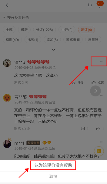 方法一、虽然评价没有用恶意的语言,但是每句对卖家都是伤害。首先找到该评价,点击“三个点”位置,会弹出“认为该评价没有帮助”。然后可以找购买过的人(老顾客)去点击;找收藏加购过的人去点击;找浏览过该宝贝的人,身边的朋友或者同事去点击。